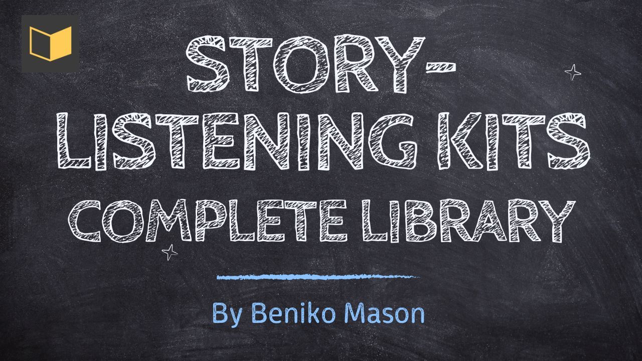 Every kit includes a level-adapted story, a prompter with drawings, a vocabulary handout, and a video of Dr. Mason telling the story. 19 kits and growing — new ones added regularly.